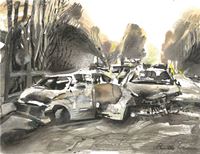A cor é fornecida por restos de carros queimados, casas destruídas e, em